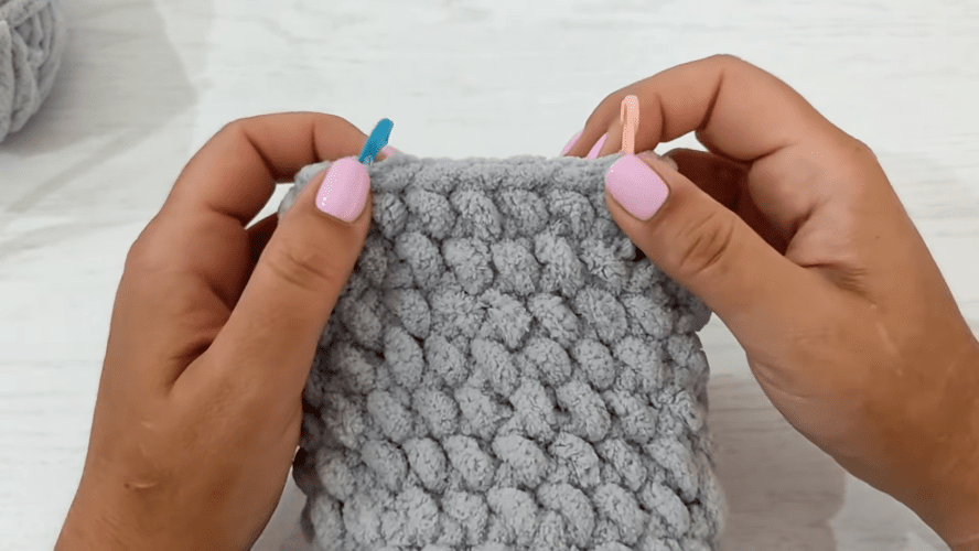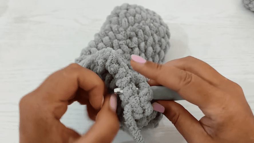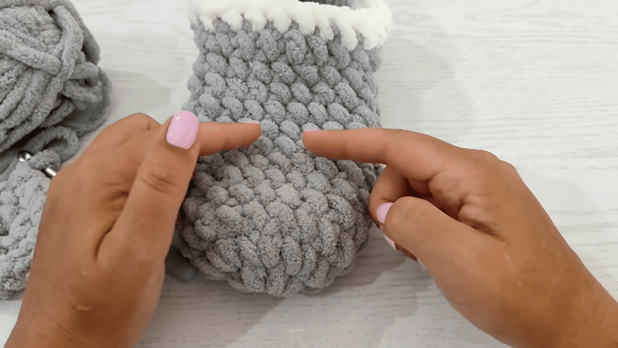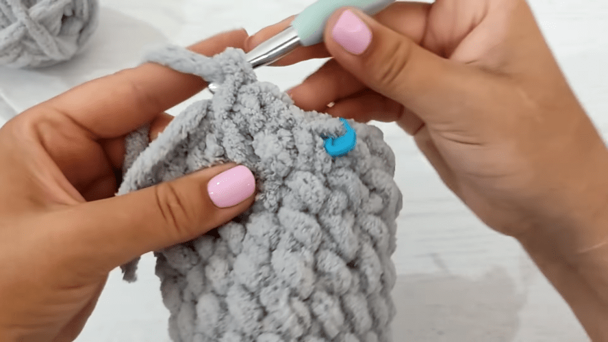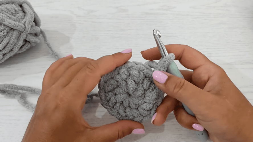 Toliau megzkite 11 eilių ratu, nepamiršdami padaryti apsisukimo kilpos, pereinant iš vienos eilutės į kitą. Eilučių skaičius gali skirtis. Pėdos centras naudojamas kaip vadovas. Kai šis tikslas bus pasiektas, padarykite slydimo akį, uždarykite apskritimą ir nutraukite siūlą. Šiuo metu turite maišelį.
