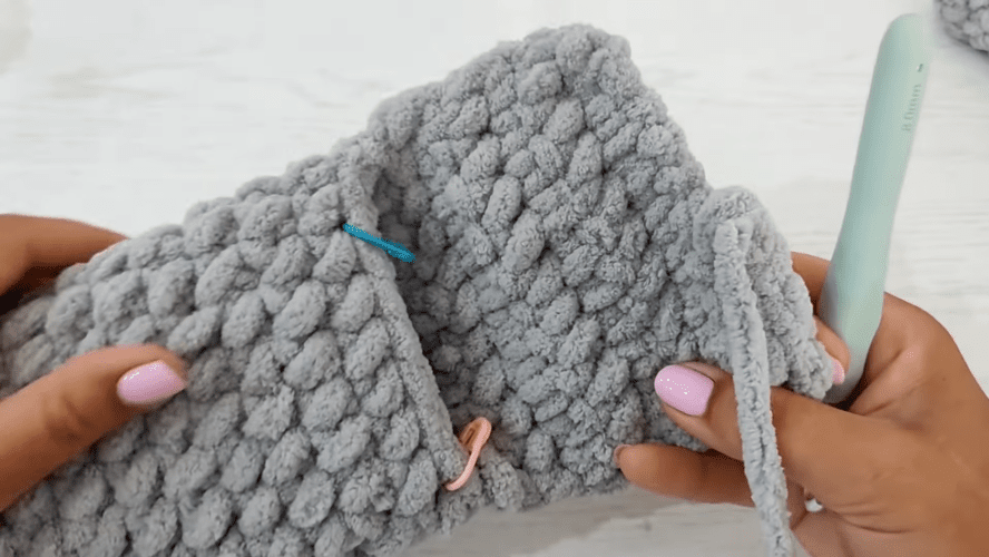 Greiti rezultatai čia daugiausia pasiekiami dėl itin paprasto mezgimo, storų pliušinių siūlų ir 8 mm vąšelio naudojimo. Tekstūra išgaunama dėl vienos detalės. Mezgant įprastus viengubus nėrimus, išskyrus rišimo eiles, vąšelis įkišamas ne į ankstesnės eilės akių pagrindą, o tarp akių (po st. bn).