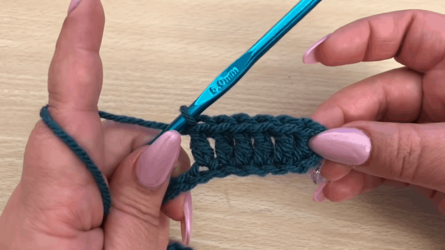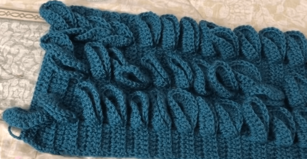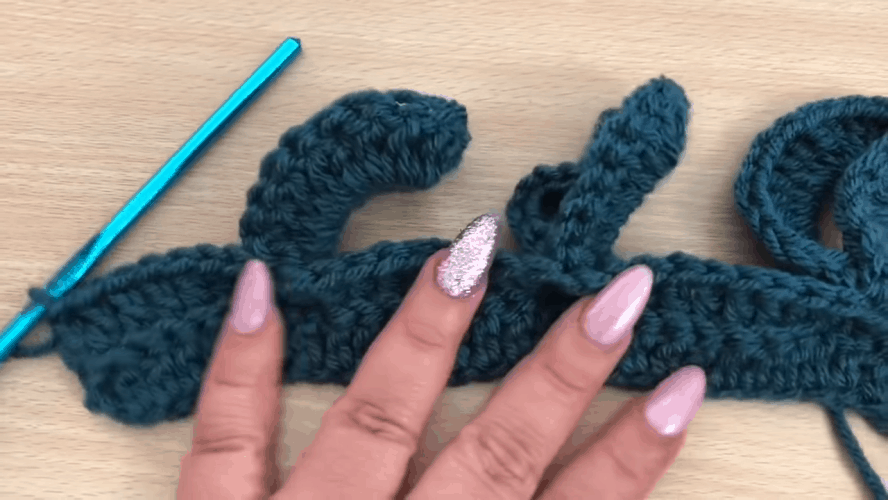 Padarome 13 kilpų grandinę ir pritvirtiname ją paskutinio (šiuo atveju 7) stulpelio viršuje. Toliau nometame 9 kilpas (kb), 9 kilpų grandinę, vėl 9 kilpas (kb) ir 9 kilpų grandinę, užbaigdami 7 kilpomis (kb).